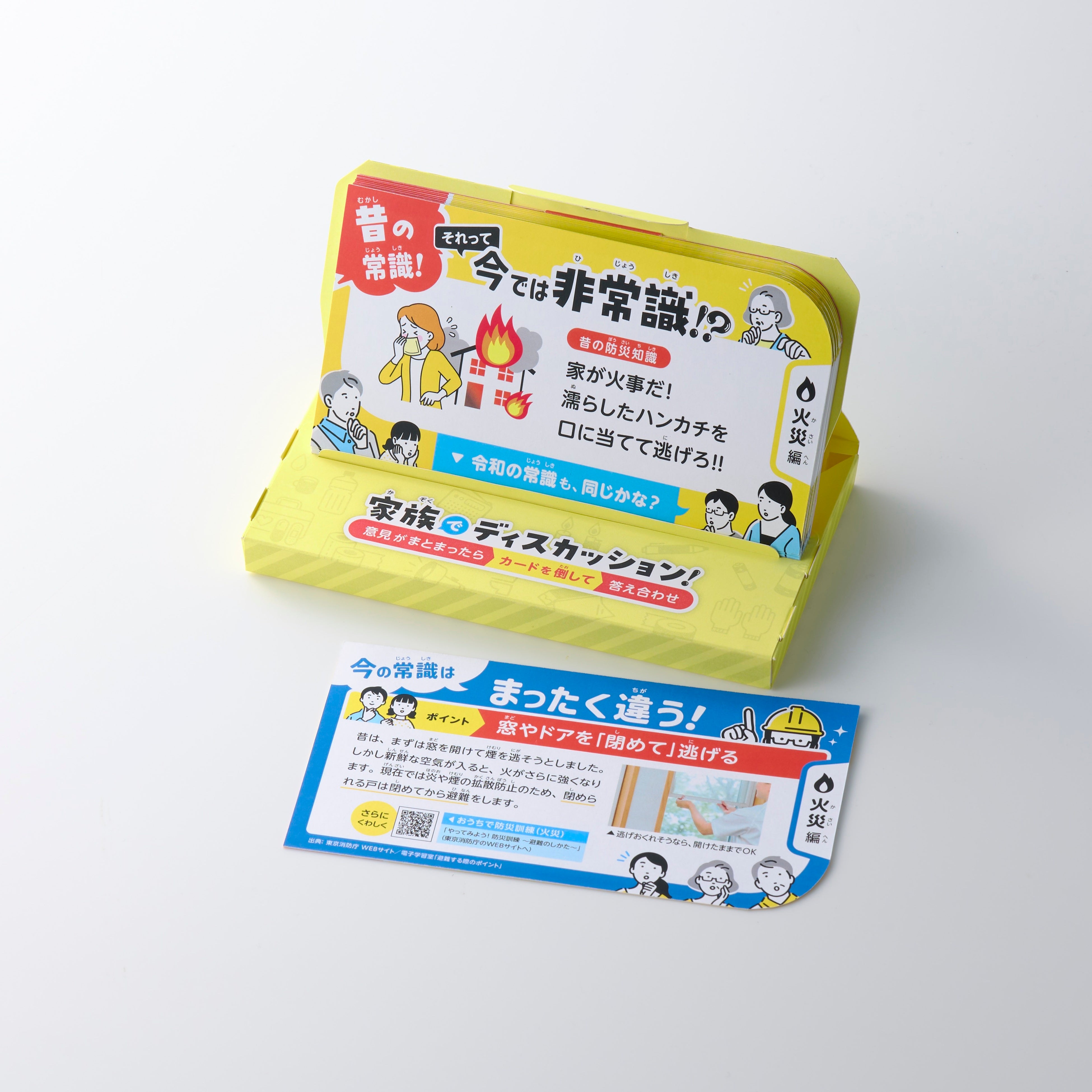 こうした課題に着目し、過去の防災常識と現在推奨されている防災行動をクイズ形式で共有するカード型ディスカッションゲームを設計しました。対話を通じて知識をアップデートし、非常時の判断力・共助力を高めることを目指した作品です。