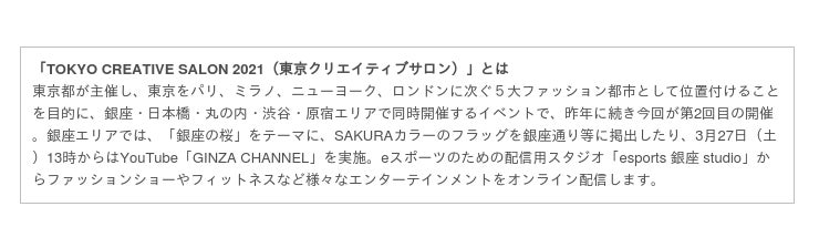 松屋銀座では、「TOKYO CREATIVE SALON 2021」の銀座エリアのテーマ「銀座の桜」に合わせて、3月15日~31日に「MATSUYA SAKURA FESTA」を開催します。