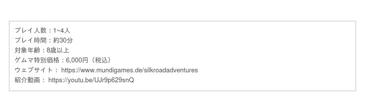 株式会社スタジオムンディでは、欧州事業を展開する子会社『ムンディゲームズヨーロッパ(Mundi Games Europe GmbH)』で販売されている欧州向けボードゲーム『Silk Road Adventures』ほか3タイトルを、10月29~30日に開催される『ゲームマーケット2022秋』のスタジオムンディブース(東1ホール A54)にて、少量入荷で限定発売いたします。