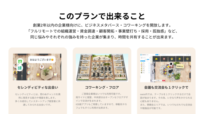 Oasisを活用することで離れていても近い距離間でコミュニケーションが取れることによりスタートアップのコミュニケーションの活性化を支援します。また、スタートアップ企業同士のネットワークキングにより、事業連携、組織運営、資金調達、事業壁打ち、採用、孤独感など同じ悩みや、それぞれの強みを持った企業同士で集まり、共有できる場として展開していきます。