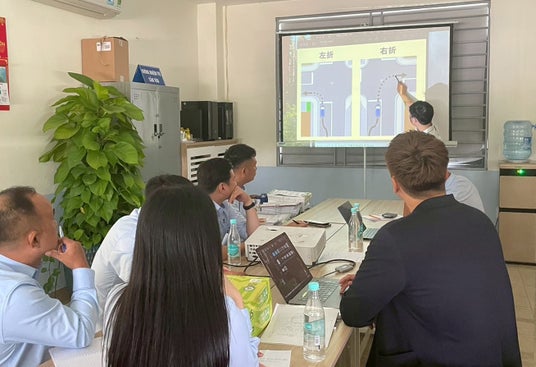 ベトナムの指導員らに交通の知識を教える広沢自動車学校の指導員中