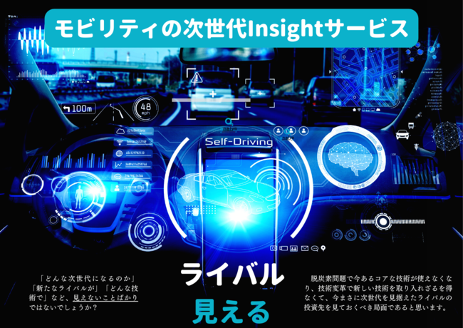 脱炭素問題で今あるガソリンエンジンなどコアな技術が使えなくなり、技術変革で新しくEV技術・IT技術を取り入れざるを得ない自動車業界にとって、次世代Planningが迫られる局面がきています。しかし、「どんな次世代になるのか」「新たなライバルが」「どんな技術で」など、見えないことばかり。次世代Planningができなくて困っているのではないでしょうか? このような状況下で見えないライバルの動きを見ることができる特許解析にニーズが高まるとみた弊社は、5月開催の「人とくるまのテクノロジー展2022横浜」出展に際し、新サービスの提供開始を発表します。商品は、報道などのニュースでは見えない動きを、特許解析を通じて見て、モビリティの次世代を見据えたライバルの動きを伝えるコンテンツです。