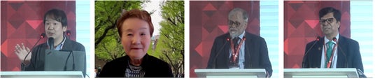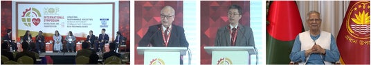 シンポジウム初日の開会挨拶では、当財団の石田寛人理事長のご挨拶から始まり、在バングラデシュ日本大使館の高橋直樹公使も来賓としてスピーチされたほか、バングラデシュ暫定政権の首席顧問でグラミン銀行の創設者、2006年ノーベル平和賞受賞者でもあるムハマド・ユヌス氏からのビデオメッセージも上映されました。