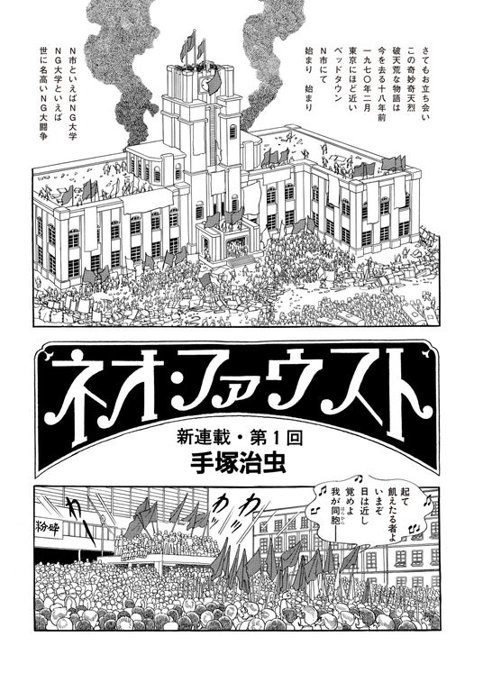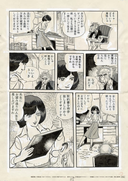 手塚治虫の知られざるライフワーク、ゲーテ『ファウスト』の漫画化。キャリア初期に児童漫画として執筆した『ファウスト』(1950)に端を発し、以降は時代劇への翻案『百物語』(1971)、そして遺作ともなった長編『ネオ・ファウスト』(1988、未完)を発表しています。中でも後者の二作品は、生前の手塚自身が併読を勧めていました(秋田書店「手塚治虫全史 その素顔と業績」より)。
