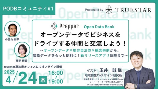 2025年4月24日(木)、株式会社truestarは、同社の提供するクリーニング済みオープンデータサービス、Prepper Open Data Bank(PODB)初の公式コミュニティイベント「オープンデータでビジネスをドライブする仲間と交流しよう!~オープンデータ×地方自治体×観光事例から、気象データをもっと便利に!新リリースアプリ体験まで~」を開催いたします。
