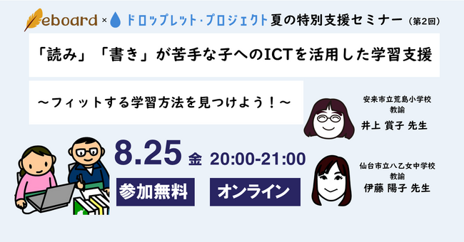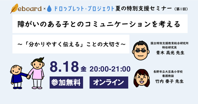 NPO法人eboardは8月、NPO法人ドロップレット・プロジェクトの先生方と、井上賞子先生、伊藤陽子先生をお招きし、2週連続・無料オンラインセミナーを開催します。特別支援教育のプロフェッショナルとして、日々特別支援学校や特別支援学級、通級指導教室などで子どもたちと接している先生方が、コミュニケーションや学習支援についてお話します。障がいや認知の特性のある子と関わる先生方、教育関係者、保護者の方など多くの方のご参加を受け付けています。