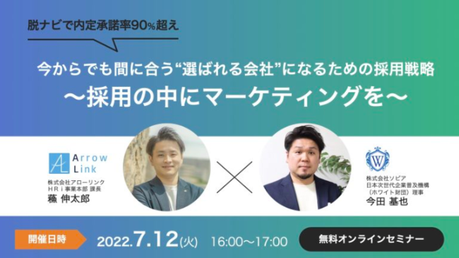 株式会社アローリンク(本社:兵庫県神戸市中央区、代表取締役:蓬莱和真)と、株式会社ソビア(本社:大阪市北区、代表者:岩元翔)は、7/12(火)に無料オンラインセミナーを開催することを決定いたしました。「“選ばれる会社”になるための採用戦略」と題し、90%以上を内定承諾に導く採用ノウハウなどをお伝えします。