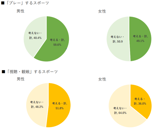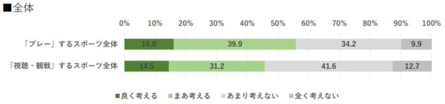 日常生活において「プレー」するスポーツのことを「よく考える」もしくは「まあ考える」と回答した人は55.9%(男性:59.6%、女性:49.1%)。一方、「視聴・観戦」するスポーツについて日常生活で「よく考える」もしくは「まあ考える」と回答した人は45.7%(男性:51.8%、女性:36.0%)で、「プレー」するスポーツの方がより日常生活に入り込んでいることが伺える。また性別では男性の方が女性よりも「プレー」「視聴・観戦」するスポーツ共に日常生活で考えていると回答した割合は高い。(本調査結果より)