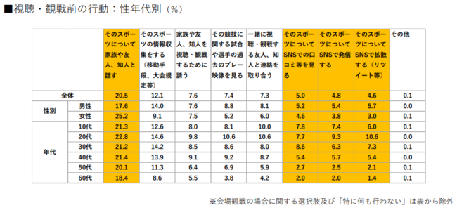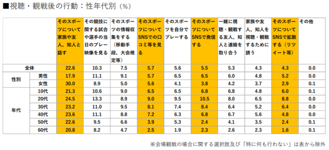 スポーツを「視聴・観戦」する前と後にする行動のトップは共に、「そのスポーツについて家族や友人、知人と話す」が20%を超え突出している(スポーツ前:20.5%、スポーツ後:22.6%)。年代別で見ても、全年代において同回答がトップで、若年層でさえSNSでの発信や拡散よりも、スポーツはコミュニケーションのネタとして話されていることが伺える。また性別では男性より女性の方が話す割合が高い(スポーツ前:男性17.6%、女性25.2%、スポーツ後:男性17.9%、女性30.0%)。(本調査結果より)