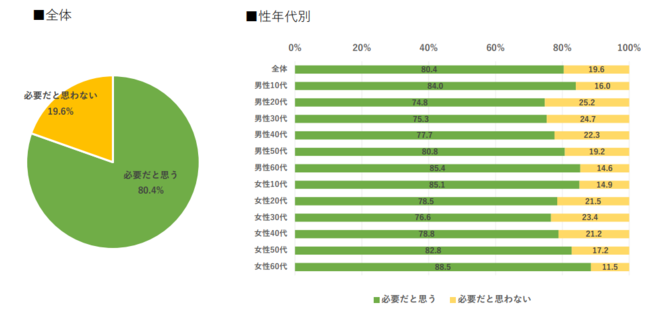 スポーツが社会にとって必要だと考える人は約8割(80.4%)。性年代別で見ると、男女共に10代及び60代の割合が特に高い(男性10代84.0%、男性60代85.4%、女性10代85.1%、女性60代88.5%)。一方、男性20代、30代の約1/4(25.2%、24.7%)はスポーツの必要性を感じていない。(スクリーニング調査結果より)