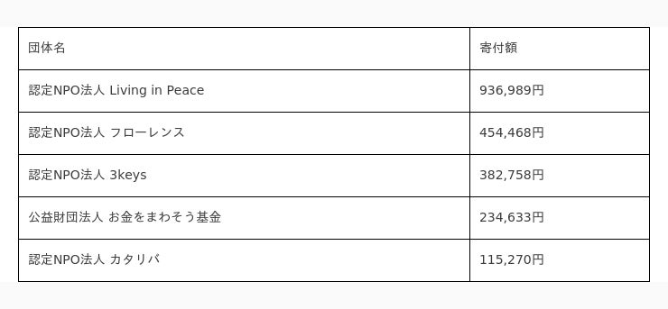 本ポイントプログラムの寄付先は日本において深刻化している子供、シングルマザー、教育問題の解決に取り組んでいる認定NPO法人などの団体が対象です。2022年度は社会貢献ポイントプログラムに5団体が参加、それぞれの団体に以下の寄付が行われました。
