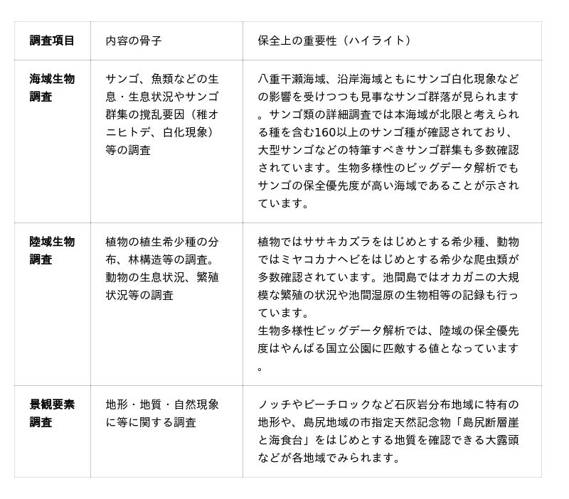 国定公園指定に向けた基礎資料整備の一環として、八重干瀬及周辺地域(池間島、大神島、狩俣地区、島尻地区、フデ岩など)を対象に、海域、陸域、景観要素に関する詳細な自然環境現況調査が実施されています。