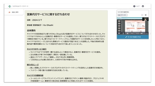 喋ラボEditorは、オンライン会議にAIボットを参加させることで、会議終了後に自動的に議事録を生成するサービスです。この議事録はただのテキストに留まらず、特定のトピックを選択すると、動画の中の該当タイムラインに直接ジャンプできる機能や、音声、テキスト、映像が同期してハイライトされる機能を備えています。これにより、会議内容の効率的な振り返りが可能となり、生産性の向上に貢献します。