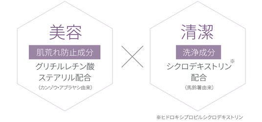 カンゾウ・アブラヤシ由来の肌荒れ防止成分「グリチルレチン酸ステアリル」と馬鈴薯由来の洗浄成分「シクロデキストリン※」を配合。