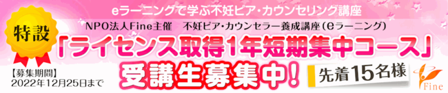 NPO法人Fineは、2023年1月より不妊ピア・カウンセラー養成講座 第十八期(2023年8月資格取得予定)を開講します。