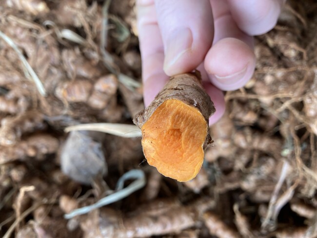 種芋を選ぶにあたり様々な国のウコンを集め、クルクミンを自社で分析したところ、農園周辺の地場のウコンがクルクミン含有量 約7,300mg(100gあたり)であることがわかりました。これは、中国やインドなどの産地のウコンに比べ2~3倍量に相当する量であったので、「地産地消」の観点からも、この品種で進めることにしました。