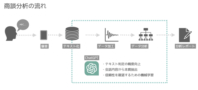 店舗での営業は簡単なマニュアルで運用する企業もありますが、大半は属人的な営業スタイルになり、品質の向上や内容の平準化が難しいという課題がありました。この課題に対して、商談を録音し当社のシステムで解析することで、商談内容の過不足や言葉遣い、速度や話題の割合や順番など様々な観点から課題と改善策を提供することができるようになりました。