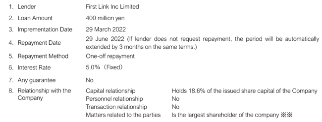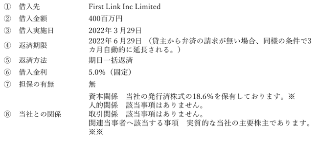 ※※当社では、関連当事者との取引に関しては、社内にてその相当性について審議・検証する体制を整備しております。当該取引の目的が、EV事業を進める上で、必要不可欠であり、当社グループの今後の業績回復を目指すにあたり、その必要性は高いと判断し、その相当性は妥当であると判断しております。また、本件借入について、市場金利等との乖離が大きくないことを確認し、借入に関する条件等を決定しております。