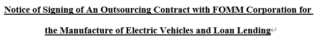 The Company decided that Quantum FOMM (“QF”), a subsidiary of the Company, and FOMM Corporation (“FOMM”) signed a "Memorandum" in relation to outsourcing of electric vehicle (EV) manufacturing, etc. with FOMM, and granted a corresponding loan (the “Loan”) at the board meeting held today,. The details are as follows.