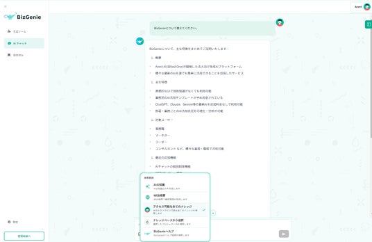 BizGenieのRAG機能は、チャットの画面上での選択だけで簡単に切り替えが可能です。