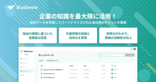 株式会社Arent AI(旧VestOne)(本社:東京都港区、代表取締役社長:山崎 翼、以下「Arent AI」)は、法人向け生成AIツール「BizGenie」に新機能として、社内データの追加学習機能(RAG: Retrieval-Augmented Generation)をリリースしたことをお知らせいたします。