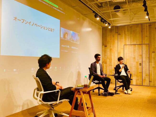 登壇者は、公益社団法人Well-being for Planet Earth共同創業者兼理事である北川 拓也氏(以下、北川氏)、2020年に日本でリカーシブを設立したティアゴ・ラマル(以下、ラマル氏)、及びオープンイノベーションのプロフェッショナルであるエイコンの村田 宗一郎氏(以下、村田氏)の3人。最近のマイクロソフト社によるOpenAI社への投資に触れ、自社でリソースを持たない分野を取り入れて活用することにより、より強力なビジネスを生み出す、このような世界のトレンドでもあるAIとオープンイノベーションの活用についてトークセッションがスタートしました。