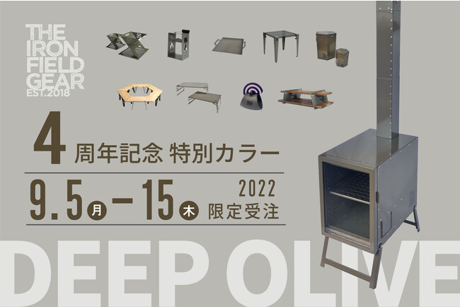 鉄加工のプロフェッショナルによるアウトドアブランド「THE IRON FIELD GEAR(ジ アイアン フィールド ギア)」を展開する株式会社興栄企画(本社:香川県丸亀市、代表取締役:森山竜志)は、ブランド創立4周年を記念して新色「ディープオリーブ」色の10種類14製品を2022年9月5日(月)より受注開始いたします。