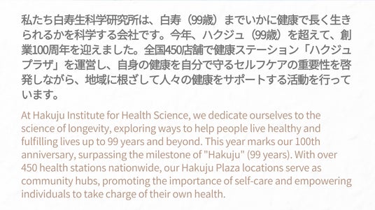 株式会社白寿生科学研究所は、「健康を通して人類の幸福を実現する」を企業理念として、大正14年に創業にした健康総合企業です。創業以来、すべての人に白寿(99歳)まで健康で過ごしほしいとの願いから、身体を自然な状態に保つことで健康維持を目指す「白寿健康哲学」の普及を使命としてまいりました。1963年に厚生省(現・厚生労働省)より承認を受けた世界初の家庭用・医療用電位治療器「ヘルストロン」は、累計100万台以上のロングセラーとして、約5000か所の医療機器・福祉施設に設置されています。また、当社の健康哲学の一つである「バランスのとれた食事」、「ゆとりある精神」を実現するため、健康食品・サプリメントの製造・販売や、リクライニング・シートを導入した世界初のクラシックホール「Hakuju Hall」を運営し、人々の健康のトータルコーディネートを目指しています。現在、全国450店舗で運営している健康ステーション「ハクジュプラザ」では、ヘルストロンや健康食品・サプリメントの販売を行うとともに、地域に根ざした健康情報発信拠点を目指し、地方自治体との連携強化を推進しています。