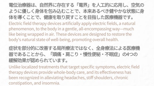 電位治療器とは、自然界に身近に存在する電界の力を人工的に応用し、空気のように優しく身体全体を包み込むことで治療をする、非侵襲性(生体に傷をつけない)の医療機器です。現に身体に生じている症状に投薬や手術により直接アプローチをする対症療法ではなく、自然治癒力に働きかけて、身体を本来あるべき状態に整えることで治療を目指す、根本療法をコンセプトとしています。