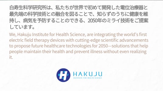世界初の電位治療器を生み出した電位治療器のリーディングカンパニーである、株式会社白寿生科学研究所は、2050年の「いのち輝く未来社会」を舞台に、今から約100年前に発明した電界を治療に活かす技術の可能性を、長寿社会の未来を切り開くミライ技術として企画展示しています。