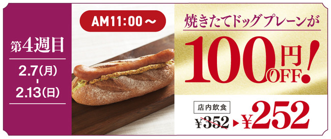 <第4週目は、「焼きたてドッグ プレーン」が “100円”OFF!252円の特別価格で販売>