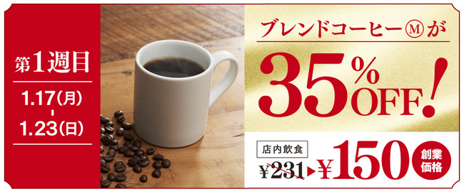 <第1週目は、「ブレンドコーヒー」が創業価格で登場!“35%”OFFの150円で販売>