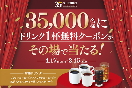 キャンペーン期間中、『カフェ・ベローチェ』でご購入いただいたレシートに印字の「QRコード(R)」を読み取ると、抽選で35,000名様に「対象ドリンク1杯無料クーポン」がその場で当たるキャンペーンも実施いたします。