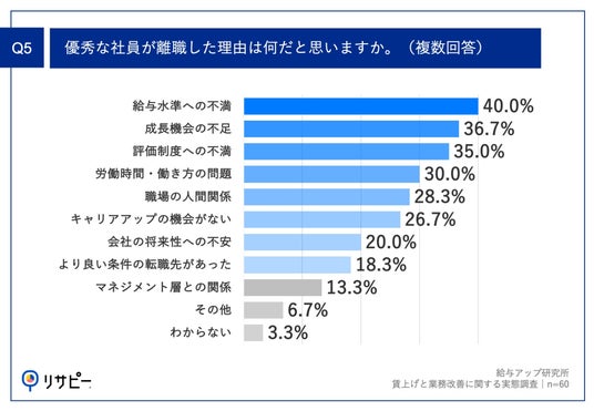 Q4で「多くあった」「ややあった」と回答した方に、「Q5.優秀な社員が離職した理由は何だと思いますか。(複数回答)」(n=60)と質問したところ、「給与水準への不満」が40.0%、「成長機会の不足」が36.7%、「評価制度への不満」が35.0%という回答となりました。