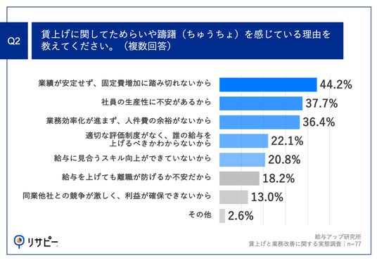 Q1で「非常に感じている」「やや感じている」と回答した方に、「Q2.賃上げに関してためらいや躊躇(ちゅうちょ)を感じている理由を教えてください。(複数回答)」(n=77)と質問したところ、「業績が安定せず、固定費増加に踏み切れないから」が44.2%、「社員の生産性に不安があるから」が37.7%、「業務効率化が進まず、人件費の余裕がないから」が36.4%という回答となりました。