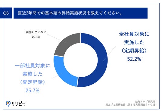 「Q6.直近2年間での基本給の昇給実施状況を教えてください。」(n=113)と質問したところ、「全社員対象に実施した(定期昇給)」が52.2%、「一部社員対象に実施した(査定昇給)」が25.7%という回答となりました。