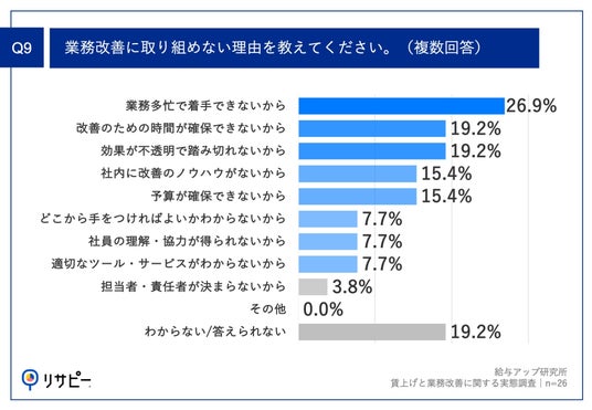 Q8で「あまり取り組めていない」「全く取り組めていない」と回答した方に、「Q9.業務改善に取り組めない理由を教えてください。(複数回答)」(n=26)と質問したところ、「業務多忙で着手できないから」が26.9%、「改善のための時間が確保できないから」が19.2%、「効果が不透明で踏み切れないから」が19.2%という回答となりました。