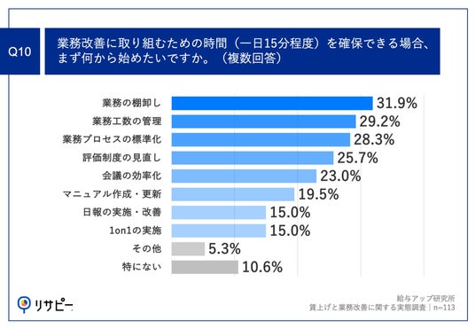 「Q10.業務改善に取り組むための時間(一日15分程度)を確保できる場合、まず何から始めたいですか。(複数回答)」(n=113)と質問したところ、「業務の棚卸し」が31.9%、「業務工数の管理」が29.2%、「業務プロセスの標準化」が28.3%という回答となりました。