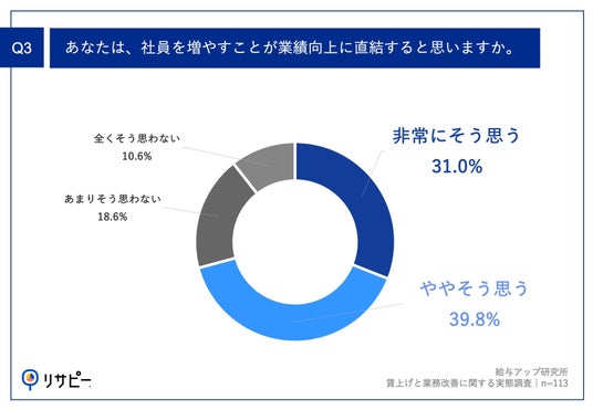 「Q3.あなたは、社員を増やすことが業績向上に直結すると思いますか。」(n=113)と質問したところ、「非常にそう思う」が31.0%、「ややそう思う」が39.8%という回答となりました。