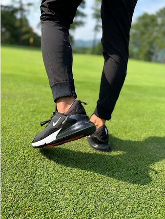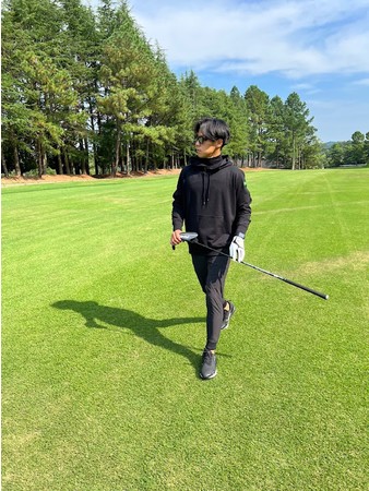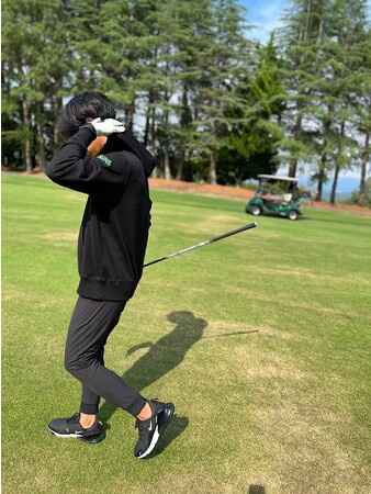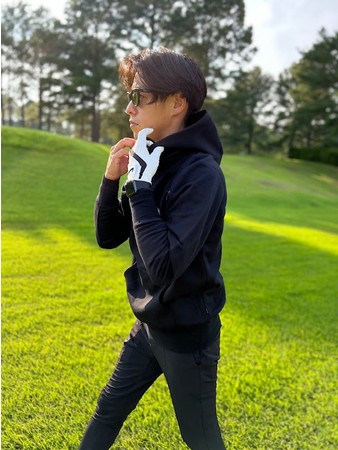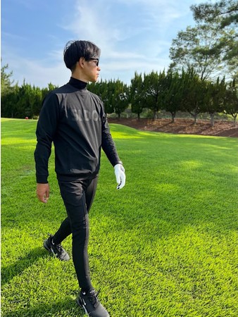 薄手のハイネックと合わせたゴルフスタイルもカッコよく決まります。