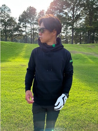 冬のゴルフウエアにぴったりの裏起毛の生地を使用。表面はフーディーらしからぬキレイめな質感。
