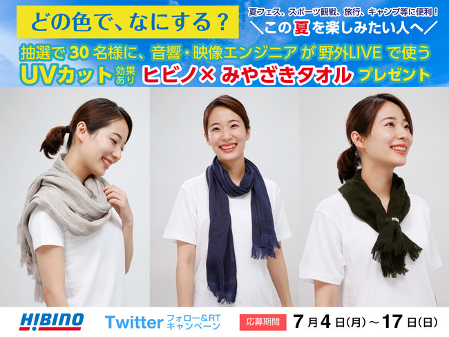大規模コンサートを中心にスポーツ大会、MICE、博覧会など様々なイベントへ音響サービス・大型映像サービスを提供するヒビノ株式会社は、この夏を楽しみたい人を対象に、2022年7月4日(月)よりヒビノグループ公式Twitter(@Hibino_Group)にてフォロー&リツイートキャンペーン「どの色で、なにする?」を開催します。ご応募いただいた方の中から抽選で30名様に、機能と軽さにこだわったヒビノ×みやざきタオル「ヒビノ・オリジナルタオル」3種3色からロングサイズのブラック、レギュラーサイズのネイビー、ショートサイズのチタンのいずれかをプレゼントいたします。
