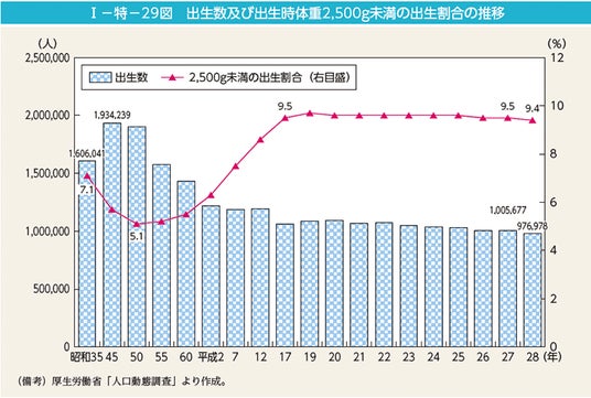 「●低出生体重児は、出生後にも医療的ケアが必要となる場合も多く、また、発育・発達の遅延や障害、成人後も含めた健康に係るリスクが大きいことが指摘されています。そのため保護者は、出生直後、他院後、乳児期、幼児期、学齢期と行ったライフステージごとに、健康や障害、発育・発達、学習など、様々な不安を持ったり、育児上の困難を抱えたりしやすい傾向にあると言われています。」(平成30年度こども・子育て支援推進調査研究事業 小さく産まれた赤ちゃんへの保健指導のあり方に関する調査研究事業」より)