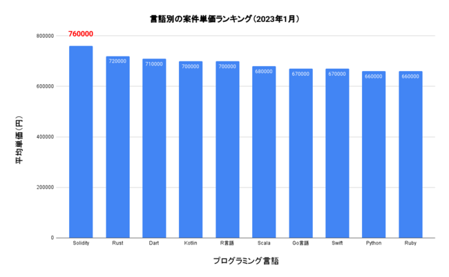 ・SoliditySolidityは、Ethereumブロックチェーン上でスマートコントラクトを開発するために使用される最も一般的な言語の1つです。Solidityは、C++やJavaScriptなどのさまざまな言語の構文を参考にして開発された言語で、Ethereum Virtual Machine(EVM)上で実行されます。Solidityは、Ethereum以外のブロックチェーン上でも利用されており、人気の高い言語の1つとなっています。「エンジニアスタイル東京」に掲載された10万件以上の案件を分析した結果、月額受注平均単価は76万円と全プログラミング言語の中で1位