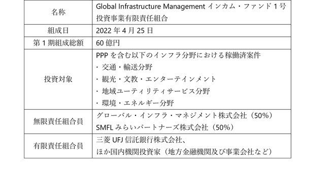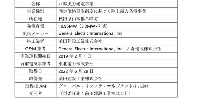 グローバル・インフラ・マネジメント株式会社(本社:東京都千代田区、代表取締役:岐部 一誠、土田 博志、以下「G社」)、および三井住友ファイナンス&リース株式会社(本社:東京都千代田区、代表取締役社長:橘 正喜)の戦略子会社であるSMFLみらいパートナーズ株式会社(本社:東京都千代田区、代表取締役社長:寺田 達朗)は、共同無限責任組合員(GP)として、国内の稼働済みインフラ事業等を投資対象としたインフラファンド、Global Infrastructure Managementインカム・ファンド1号投資事業有限責任組合(以下「本ファンド」)を、三菱UFJ信託銀行株式会社(本社:東京都千代田区、取締役社長:長島 巌)をはじめとする国内機関投資家と共同で組成し、その第1号投資案件として、秋田県八峰町の風力発電事業への投資を完了しましたことをお知らせします。