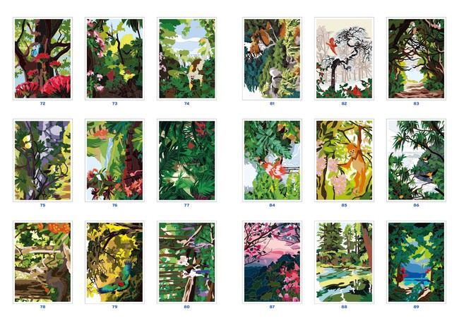 そびえたつ桜の木々、鳥たちがさえずるジャングル、色鮮やかな紅葉林、雪つもる針葉樹など。ひとつひとつ塗り進めるごとに、世界各地、四季折々の美しい森が現れます。