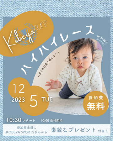 特定非営利活動法人ほっぺ(代表:大森 奈津子)による赤ちゃん向けイベントが、2023年12月5日(火)にコーベヤスポーツ三木店3階にて、「hoppeハイハイレース~Kobeya CUP!~」を開催いたします。今回は、初の平日開催です。KOBEYA SPORTSとの共催となります。