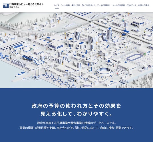 行政事業レビューは、各府省庁が行う事業について、毎年度、その内容や効果を自己点検し、予算要求などに反映することで、質の高い行政の実現につなげていく取組です。国の事業の透明性を高め、国民の皆様への説明責任を果たしていくことは重要であり、このサイトでは、従来は府省庁ごとに公開されていたレビューシート等を一元的に公開することで、利用者の関心に応じて、府省庁横断で検索や集計ができるようにしています。