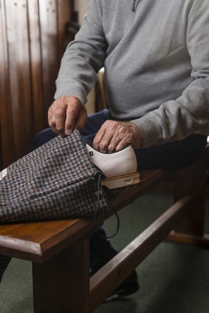 購入特典としてサドル部分に施している同素材のハリツツイード生地のシューズバッグ付。