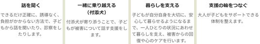 虐待、性暴力の被害を受けた児童が、中立な立場でのインタビューをうけ、権利擁護のための手続きやサポート、身体的、精神的なケア等がワンストップで長期的に受けられることを支援しています。